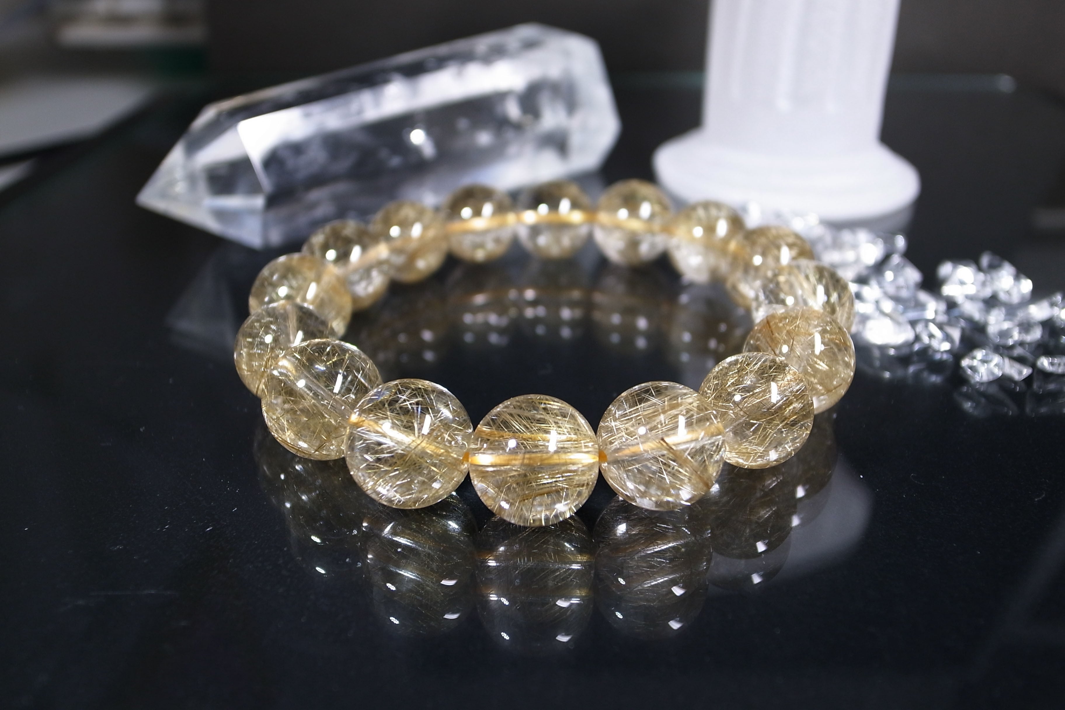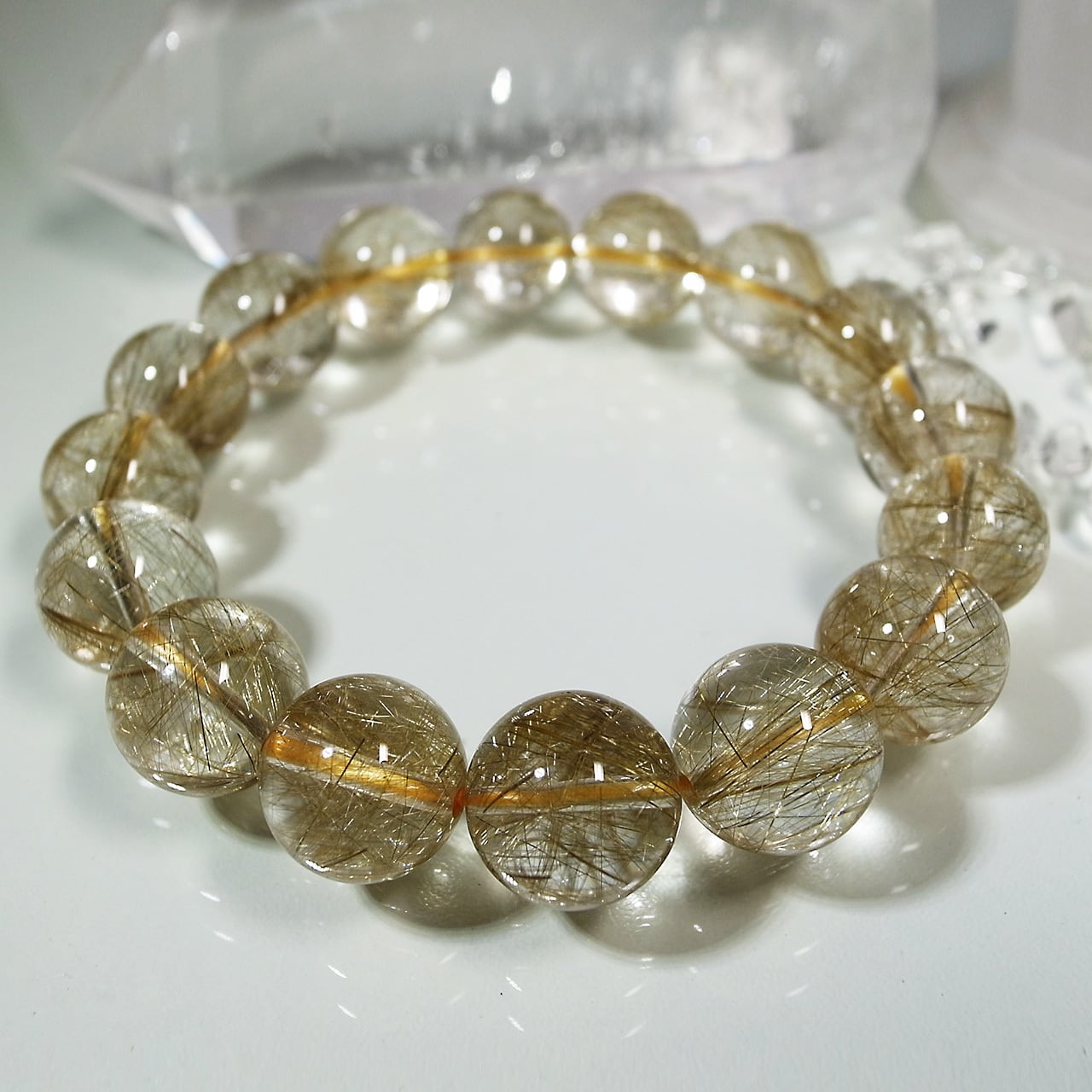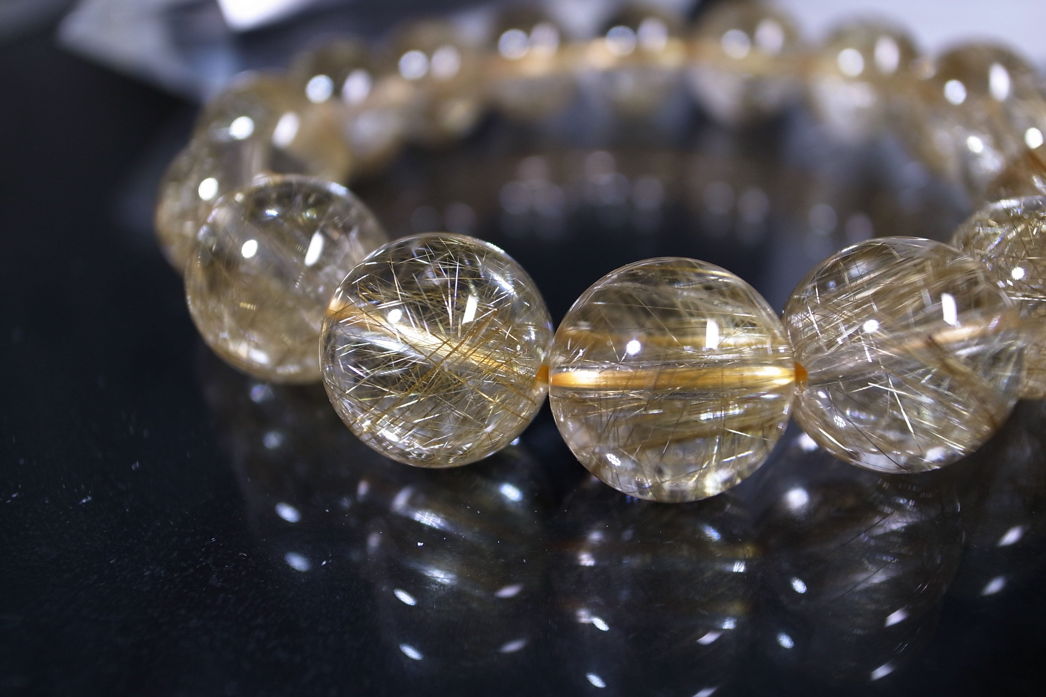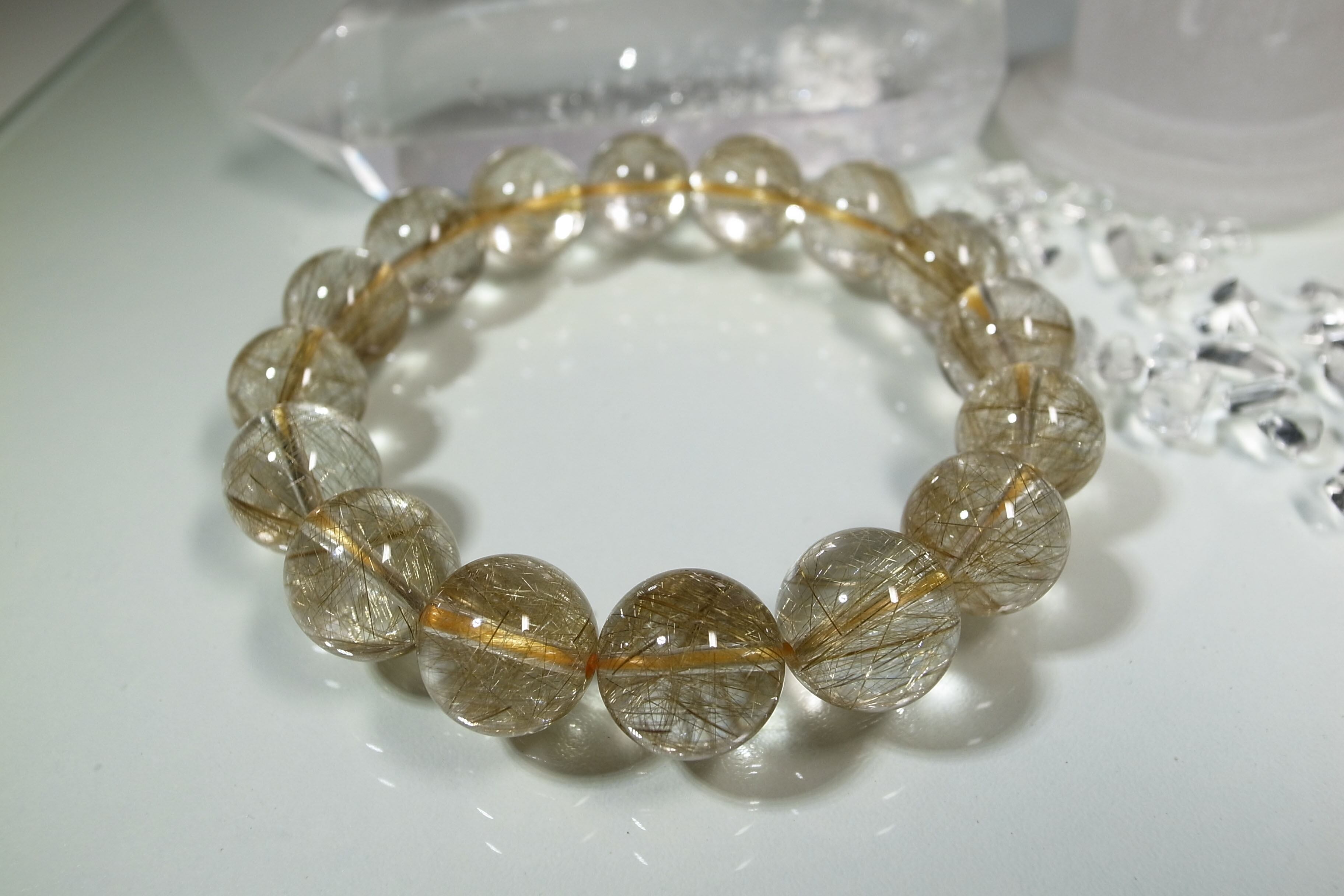 無骨ささえ感じるタイチンルチルとは違い、透明なクォーツの中には、繊細でひときわ多く金色の針状物質が含まれています。そのストーンの小宇宙に見入ってしまうほど・・・。また、金運アップの代表格とも言えるルチルクォーツ・・・パワーがみなぎっています。クォーツにはくもりがなく、品質の良さを感じていただける逸品です!豪華で美しいブレスレットは「1点もの」です。